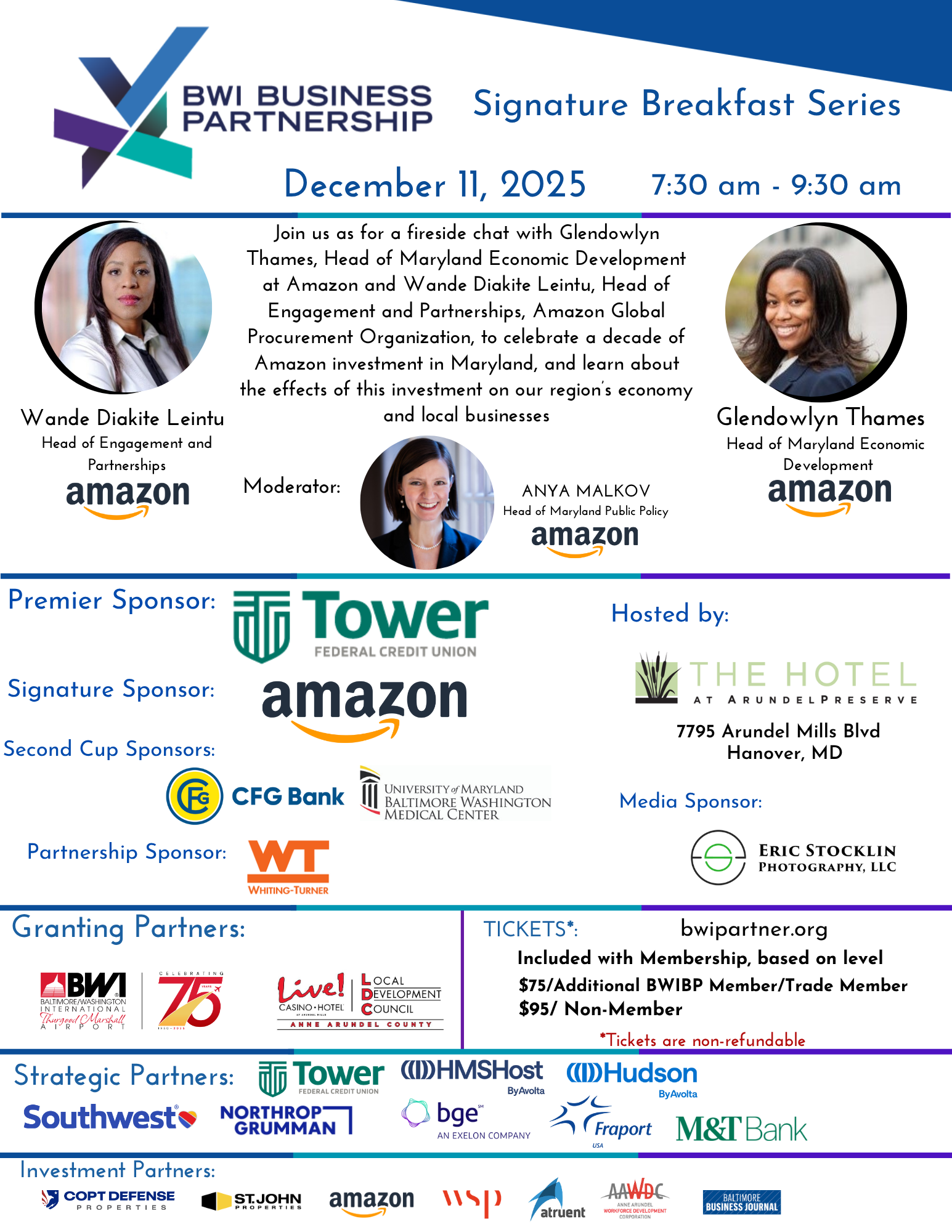 Join us as for a fireside chat with Glendowlyn Thames, Head of Maryland Economic Development at Amazon and Wande Diakite Leintu, Head of Engagement and Partnerships, Amazon Global Procurement Organization, to celebrate a decade of Amazon investment in Maryland, and learn about the effects of this investment on our region’s economy and local businesses