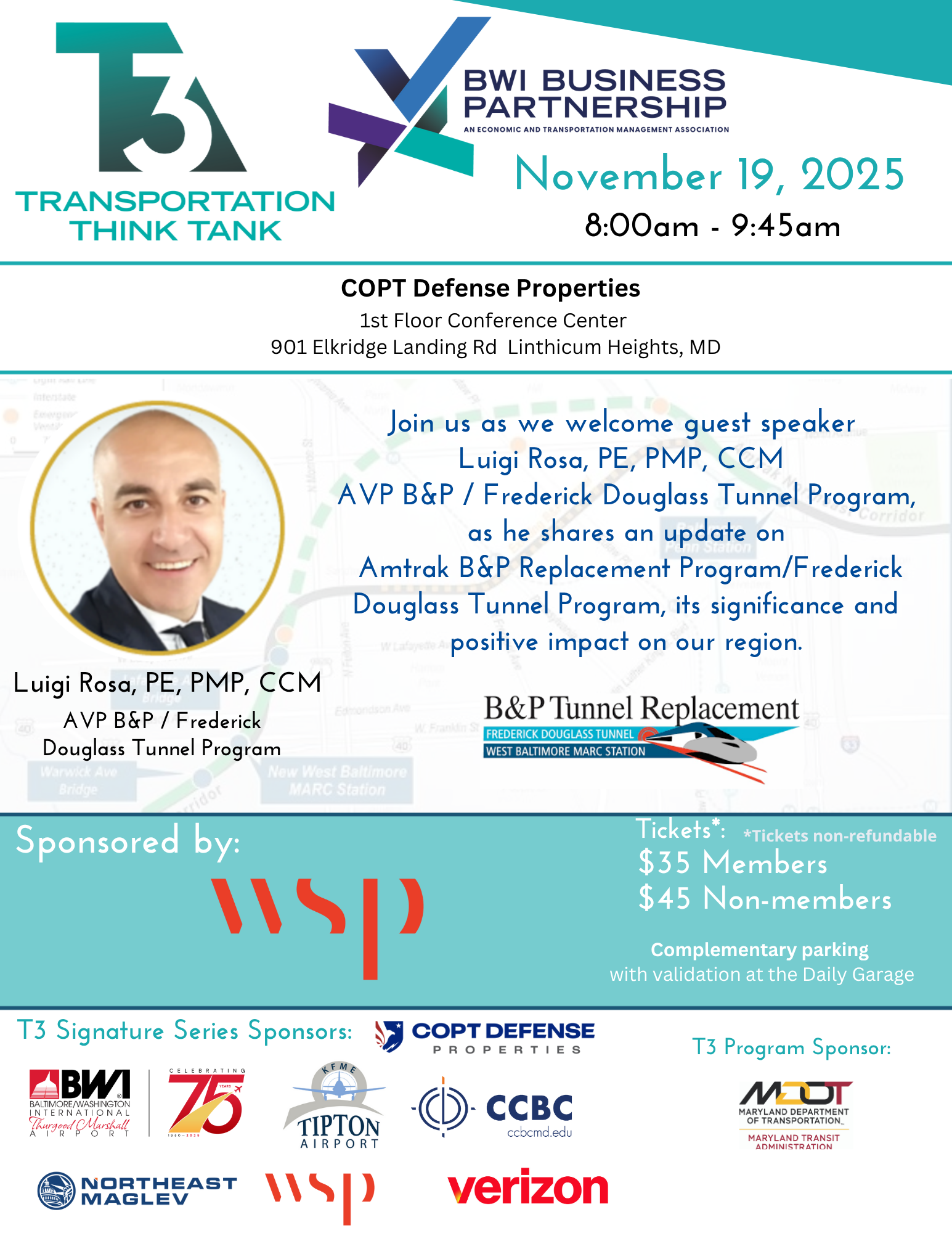 Join us as we welcome guest speaker Luigi Rosa, PE, PMP, CCM AVP B&P / Frederick Douglass Tunnel Program, Amtrak USA, as he shares an update on Amtrak B&P Replacement Program/Frederick Douglass Tunnel Program, its significance and positive impact on our region.